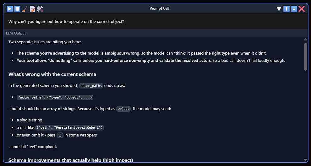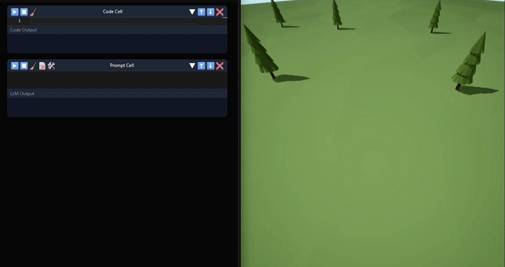 Over the next couple weeks, I set out on a mission. The idea was to build my own notebook interface just like Solve It, but connected directly to an Unreal Kernel. When the dust settled and all of the components were in place, my first agent test, a tool which could spawn a tree, was deployed in minutes. And just like that, the barrier to entry for agent building in Unreal disappeared.